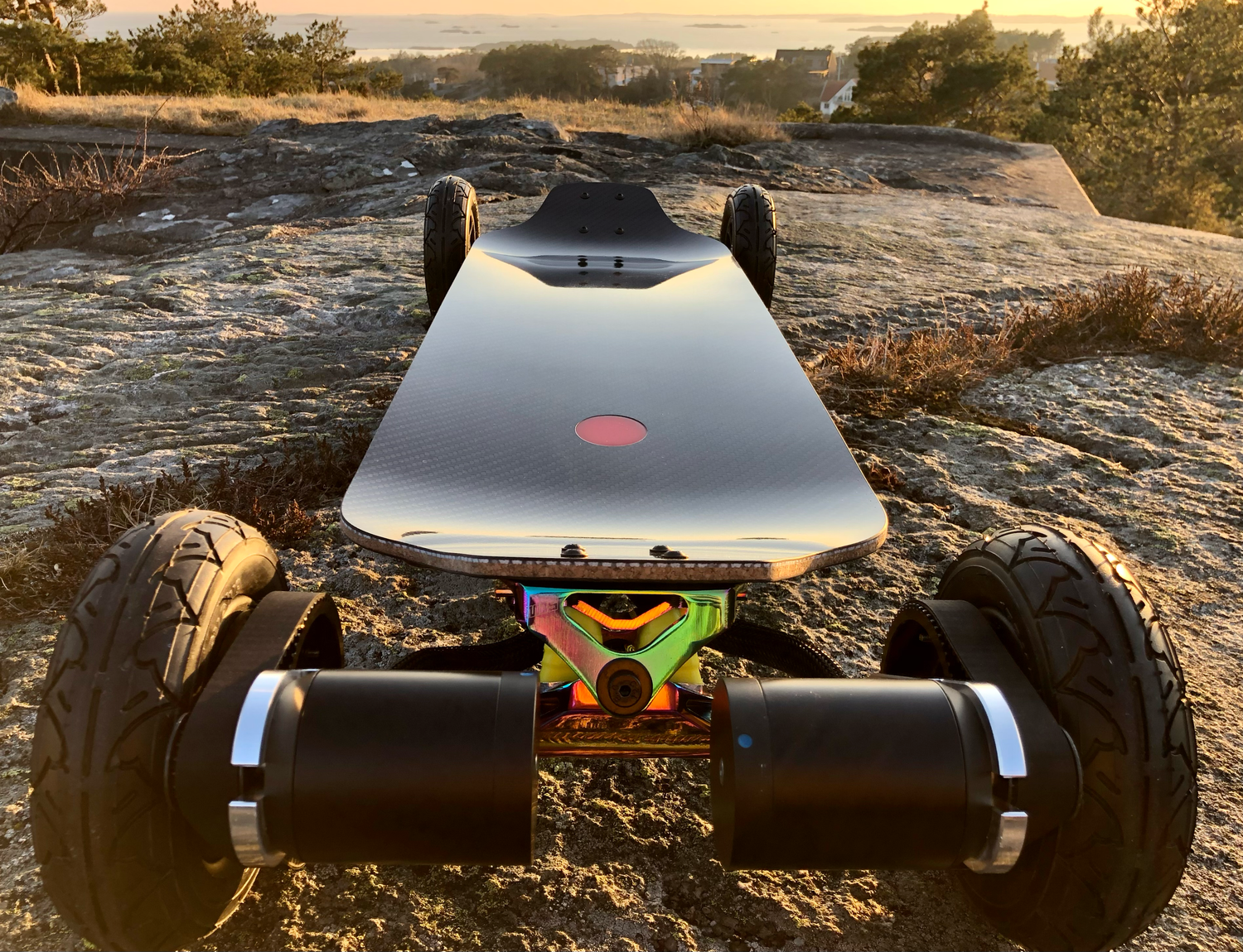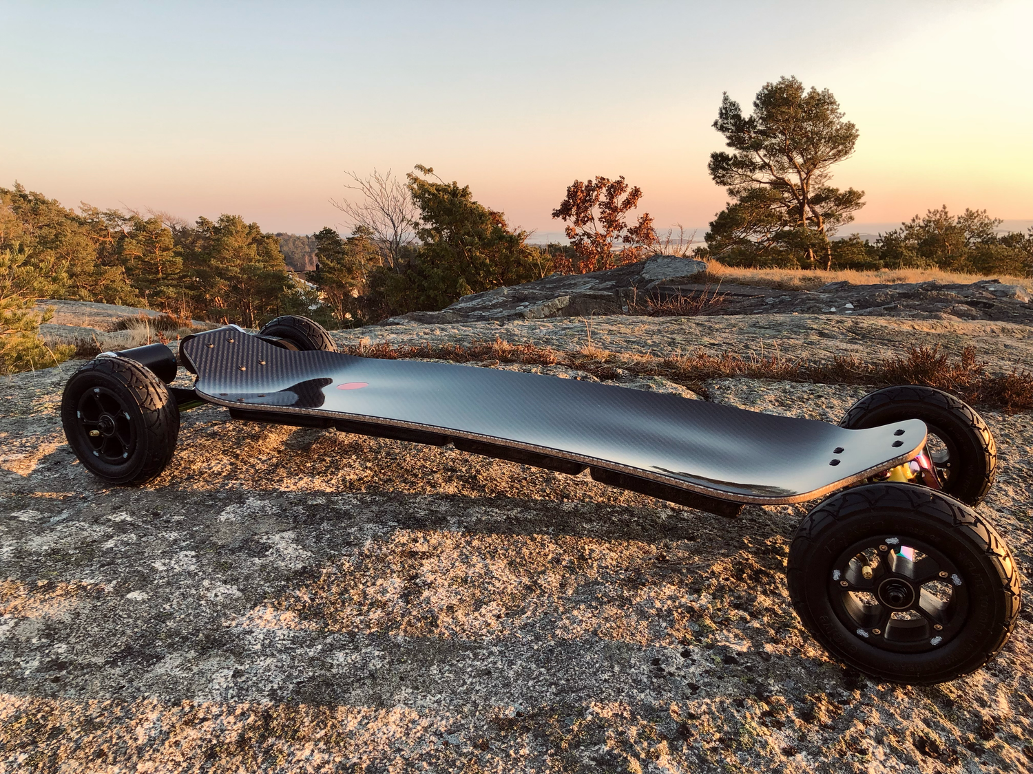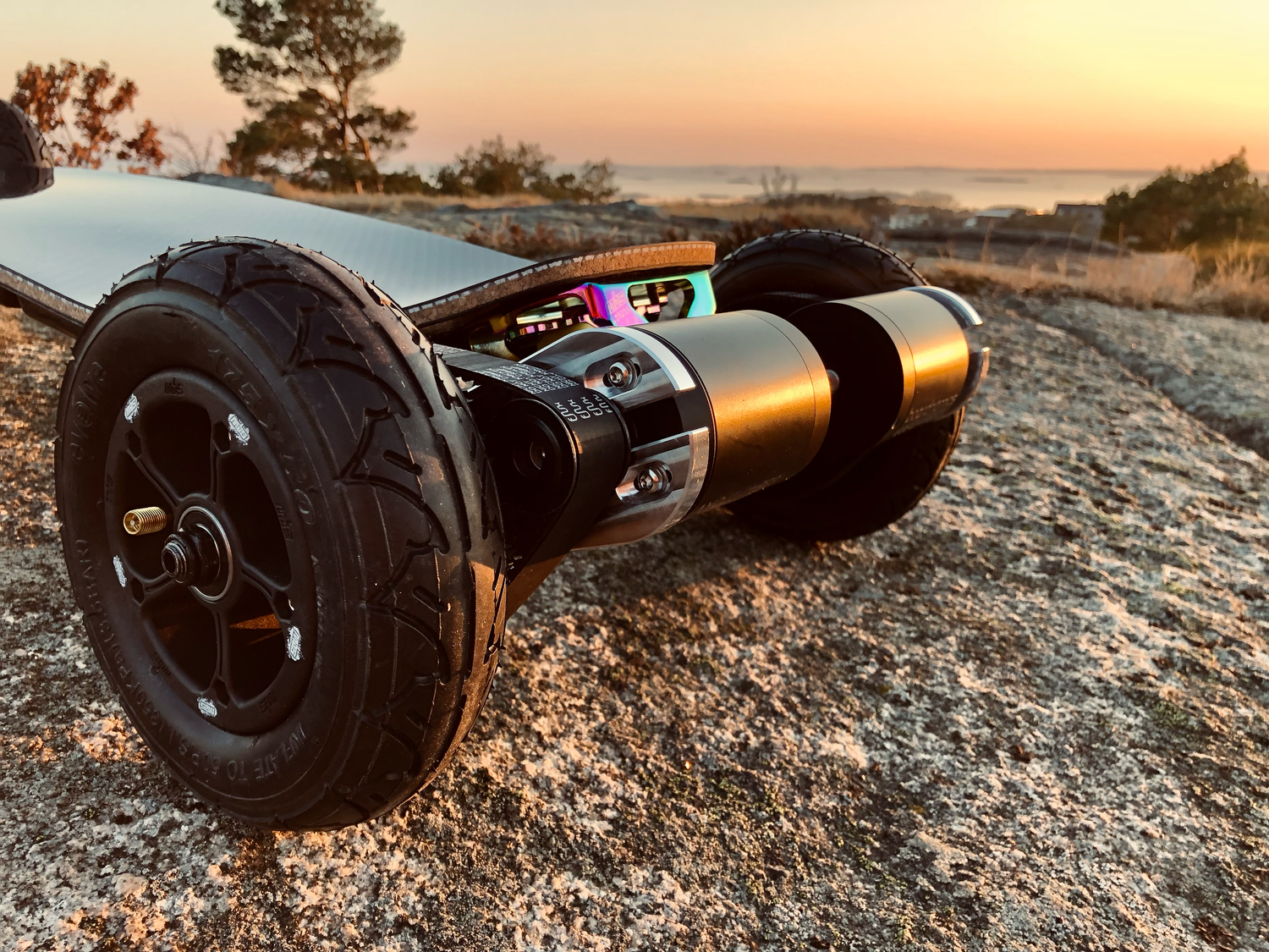 The enclosure is built from the ground up constructed to be as sleek and low profile as possible. It is built to flex and move with the very flexible deck yet having extra reinforcements where the protection is needed. It is built to perfectly contour and match the deck and just deep enough to house a single layer of cells and the tiniest of air gap above. The cables and electronics are routed to not get pinched in the event of a hit taken from below. Nearly a full tube of natural curing silicone is used to pot/glue the cells and electronics to the enclosure to make sure nothings is rubbing or vibrating loose! The amount of vibrations an electric skateboards sees is absurd, that paired with moisture and you probably have the two most common failure modes. To put things in perspective, it takes 4 full days for just the silicone to cure and just the weight of the silicone is nearly as much as the enclosure itself. However it is glued down in a way that all the electronics but the battery itself can be easily replaced in the unlikely event of a failure. Waterproofing the enclosure, motor wires, charge port and on/off button is done with butyl tape. Same goop used to keep a vacuum when making composite parts. It’s a pain to remove but nothing beats the way it seals. Fun fact back when I started testing out the the board I used a dodgy prototype ESC (never intended to be put in a production board), after a few days the ESC blew up when I turned the board on, after removing all the screws prying the enclosure up I heard a loud pop. That was the overpressure blowing open the air tight seal created from the heat of the fried ESC. If it can handle being stress tested throughout a full Swedish winter with salty, snowy & nasty roads you can rest assure the enclosure is as watertight as it gets. Designed and built from the ground up knowing how the board will be used and abused.