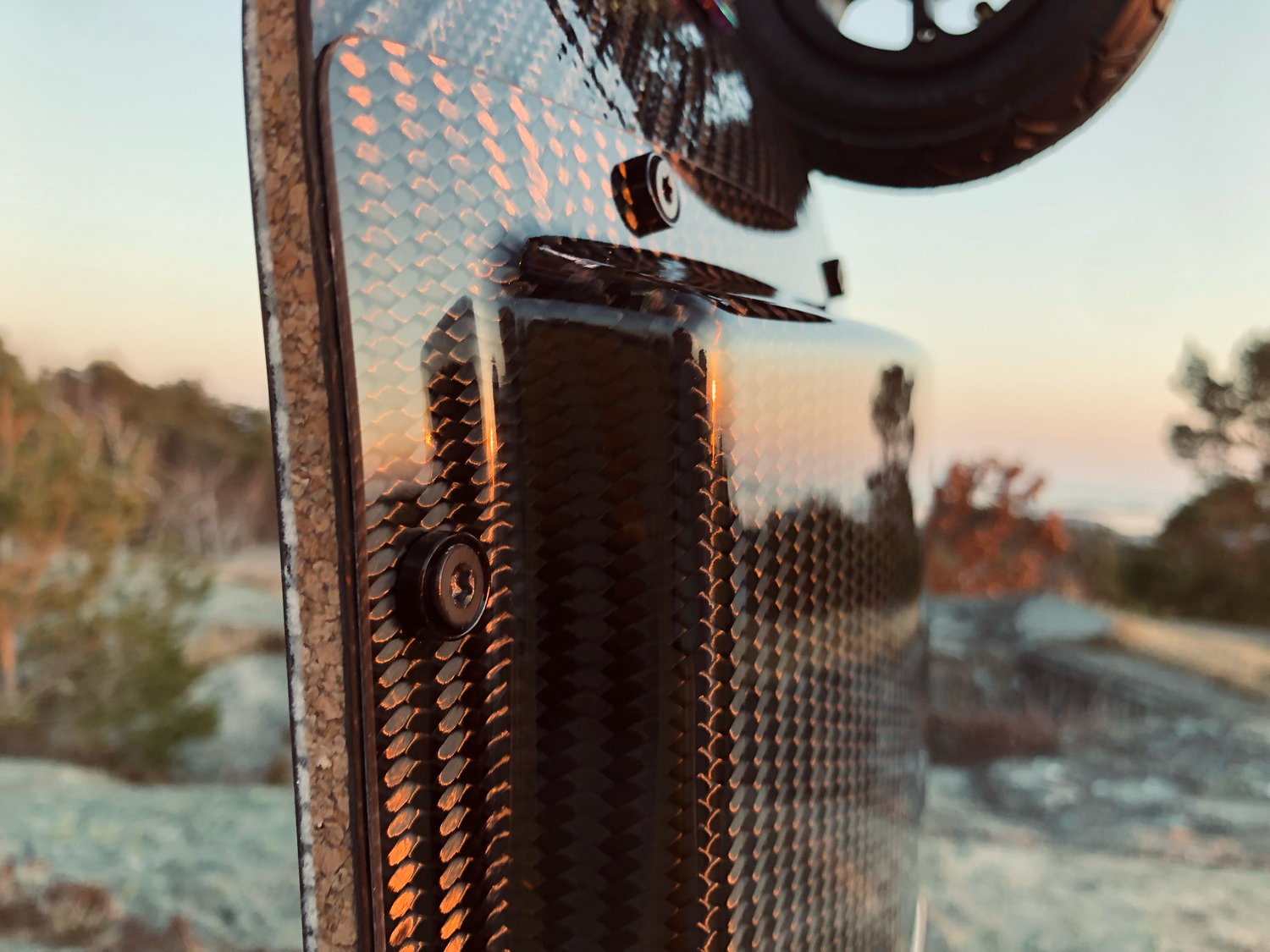 The top layer of carbon fibre is now updated (not as pictured) and uses a similar weave pattern to some of the most high end car manufacturers, Koenigsegg, McLaren & Pagani. The Enclosure is made from a variable thickness carbon fiber and flexible epoxy resin developed in house specifically for the enclosure. The inside of the enclosure has a layer of glass fiber as carbon fiber is conductive and the electronics doesn’t like that.
